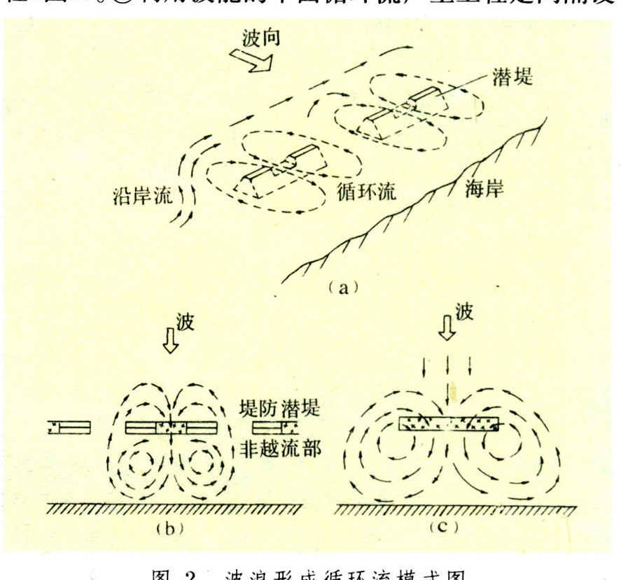 循环流产生工程 使海水产生地形性的循环流,抑制海水中浮游生物、悬浮物质和溶解物质分散的工程(图2)。①利用波能的平面循环流产生工程是间隔设置以离岸潜堤为主体的构筑物。波浪从潜堤上通过时,波能使海水成为向岸流;波浪流向潜堤,从中间通过时,波能使海水成为离岸流,从而产生平面循环流。②利用流体的垂直循环流工程是将堤顶比静水面低的构筑物同流向成直角设置,从而在其下流侧产生垂直循环流,抑制物质分散。其构造、布置应考虑增养殖对象的生态和海域的流动特性而确定。设施高度为水深的12%~30%时,垂直循环流工程的影响范围是设施高度的7倍。该工程实施后,应注意海岸线的地形变化,循环流域内的底质变化等情况。