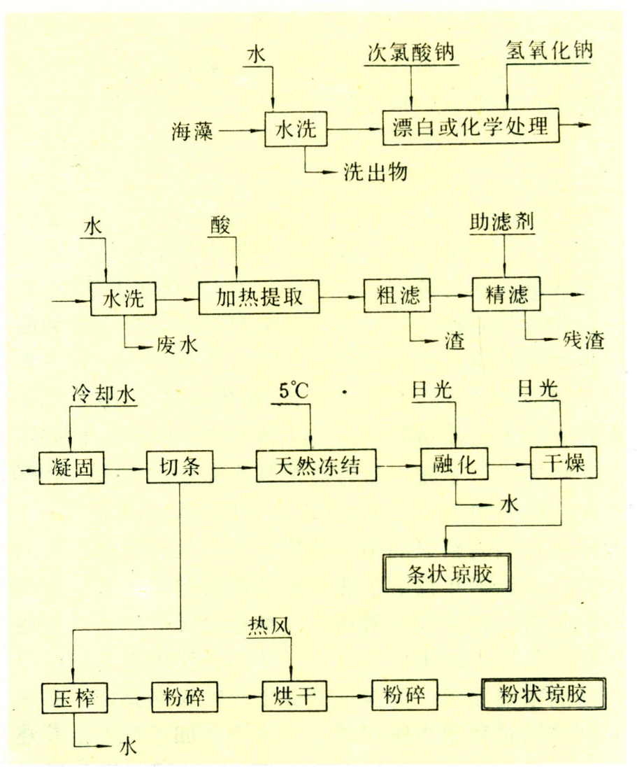 琼胶 又称琼脂、冻粉、洋菜。主要原料有石花菜、江蓠、末期紫菜等。产品有琼胶和琼脂糖。琼胶的制造包括原料的漂白加碱处理、加酸加热提取、凝固成型、冻结脱水或压榨脱水、晒干或烘干等主要工序(图1)。琼脂糖的制造是以琼胶为原料,采用碱处理和离子交换分离,除去琼胶中的硫酸基、羧基以及对蛋白质有吸附作用和凝固性差的多糖及灰分后获得的产品。
