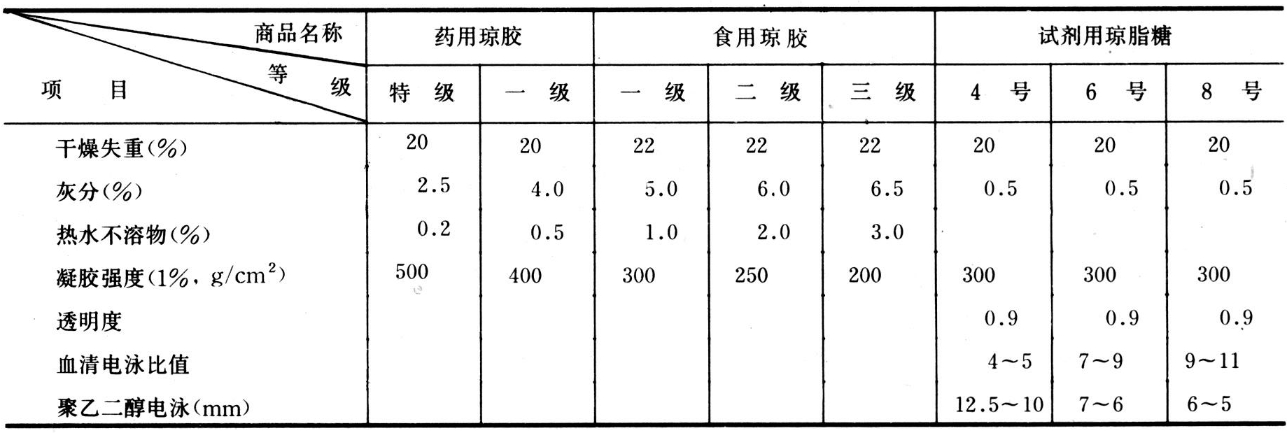 琼胶制品有条状、片状和粉末状之分。外观洁白、半透明、有光泽。药用琼胶、食用琼胶和试剂用琼脂糖的质量等级和理化指标如表1。琼胶在食品工业中用作鱼类和肉类罐头的固型剂,糕点的花边、果子冻和透明软糖等。同时是制作微生物固体培养基不可缺少的材料。琼脂糖是进行蛋白质的电泳、凝胶过滤和凝胶色层分析等实验测定的重要试剂。