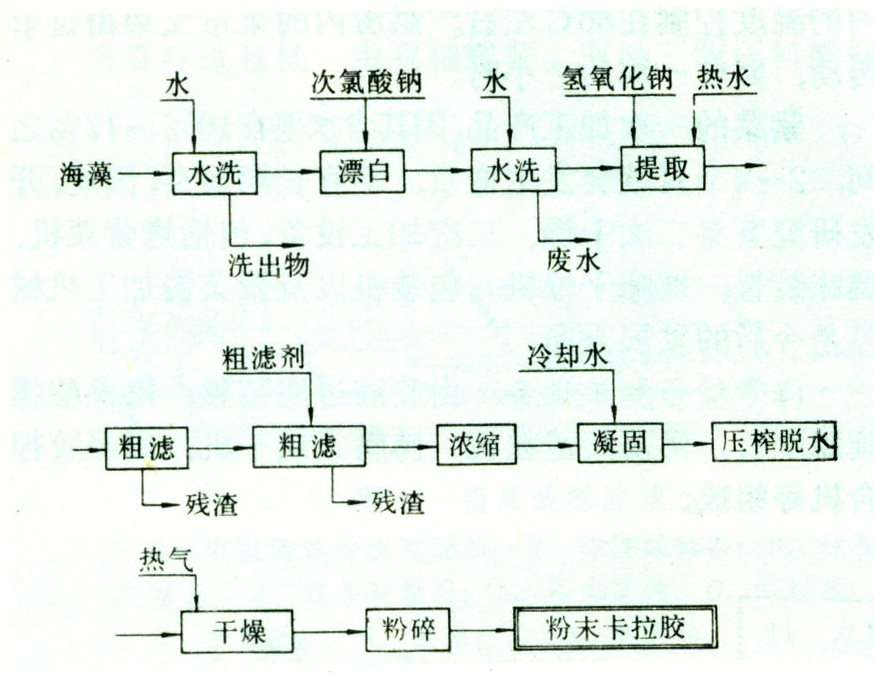 卡拉胶 又称角叉菜胶。凡含卡拉胶类似成分的红藻均可作为生产原料。主要有角叉菜、麒麟菜、沙菜、杉藻及其他红藻。原料的选择和混合配比依产品的类型和性质要求而定。卡拉胶制造工艺包括提取、净化和分离等单元操作。通常在微碱性条件下提取,使半乳糖6-硫酸酯单元转变成3,6-内醚-半乳糖结构的分子占优势。同时加入钾、钙等离子以提高凝胶强度(图2)。