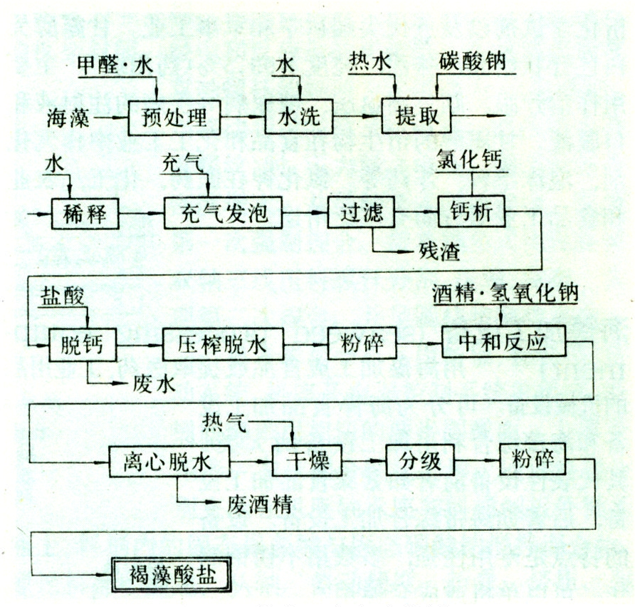 褐藻胶 包括褐藻酸、褐藻酸盐类及其衍生物等。褐藻酸以各种金属(钙、镁、铁、铝等)的不溶性褐藻酸盐混合存在于褐藻中。供作工业原料的褐藻种类主要有:海带、掌状海带、巨藻、泡叶藻等。中国主要利用人工养殖的海带和野生马尾藻为原料。褐藻胶的提取是一种典型离子交换过程:①在碱作用下,使海带中不溶性褐藻酸盐转为水可溶性钠盐,通过稀释过滤除去不溶性残渣;②再转化为不溶性的褐藻酸,进行精制和浓缩,大量的无机盐、色素等随水排除;③纯褐藻酸再转为不同类型的褐藻酸盐。生产流程见图3。