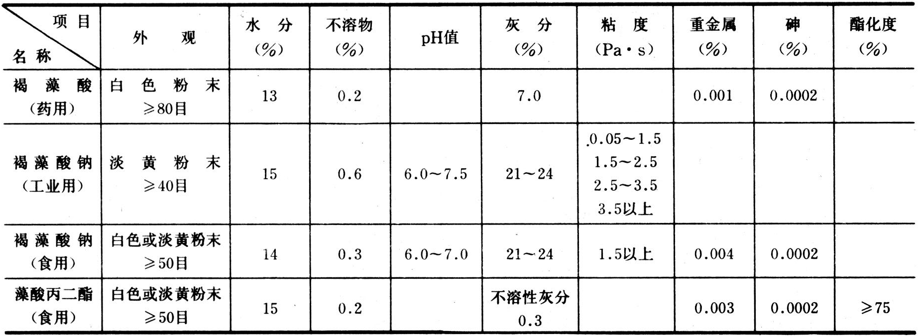 产品有水溶性和水不溶性两大类。褐藻酸的一价盐类(钠、钾、铵)和褐藻酸的有机衍生物(藻酸丙二醇酯、藻酸三乙醇铵)为水溶性;褐藻酸的二价和三价盐类(钙、铜、铝,唯有镁盐除外)为水不溶性。水溶性褐藻酸盐溶于水后,形成粘稠溶液,其用途决定于它的增稠性、稳定性、乳化能力以及凝胶形成能力的大小;不溶性褐藻酸盐具有胶凝性、保水性、成膜性和粘结性。褐藻胶广泛应用于食品、印染、医药、造纸及其他工业,在食品工业上可改善面食韧性,提高冷冻食品凝固力,改善香味逸散;用于印染工业拔染、拔白效果好,给色量高;用于医药工业可改善崩解时间,延长药物效果;在造纸工业上可改进纸张表面性质,改善涂盖层流变学特性;还可用于废水处理,净化水质。各种产品的主要质量指标如表2。