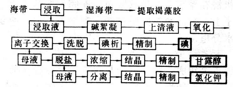 碘、甘露醇 碘是海带从海水中吸附积累在藻体内的。成熟的海带一般含碘0.3%~0.6%。甘露醇是海藻进行光合作用最初产生的一种六元醇(C6H8OH6),海带中含量最高可达15%~25%。海藻中还含有不少无机物,以氯化钾和氯化钠含量最多。这些成分的含量随生长期的不同而异。综合利用的生产流程如图4。