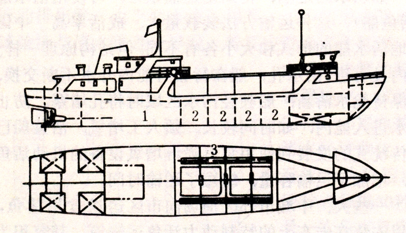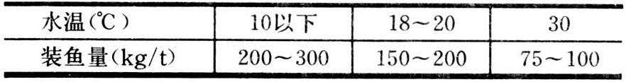 海洋活鱼运输船大多为钢质船体,船长30~50米,排水量200~700吨,主机功率几百至上千千瓦,航速10节以上;内河活鱼运输船仅几吨至几十吨,且以木质船体为多,有机动船和非机动船之分。续航时间较短,机动船的机舱均在尾部,并设有长尾楼,中、前部分隔为若干个活鱼舱或槽(见图),舷侧水线以下或船底开有若干个进水孔(阀),并有一定水位的排水孔(阀),各舱之间也有开孔连通,进、排水阀门可手控或遥控。鱼舱容积(米3)与孔(阀)个数之比值一般为0.75个/米3(孔径为φ=125毫米)。非机动船常用自然循环换水,机动船则还在机舱内设置水泵强制循环换水。鱼舱要求水密、隔热、耐腐蚀、易清洗及无毒性,通常用现场发泡聚氨酯为绝热材料,内壁有用钢板外涂聚氨酯环氧水舱清漆、不锈钢板或玻璃钢等材料。鱼舱内的鱼水比,运输淡水活鱼时为1∶3~1∶4,随温度和水质而异。中国的江苏、浙江省一带地区,载重3~10吨的木质淡水活鱼运输船,在不同季节和温度下,每吨船的装鱼量为