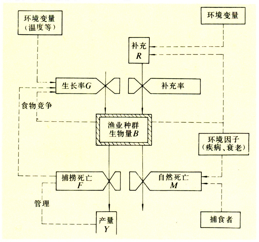虽然实际情况很复杂(见图),但是拉塞尔的关系式简明地概括了渔业种群数量变动的基本规律,为解决捕捞过度,探讨最适产量,建立渔业资源评估和管理模式等奠定了理论基础。