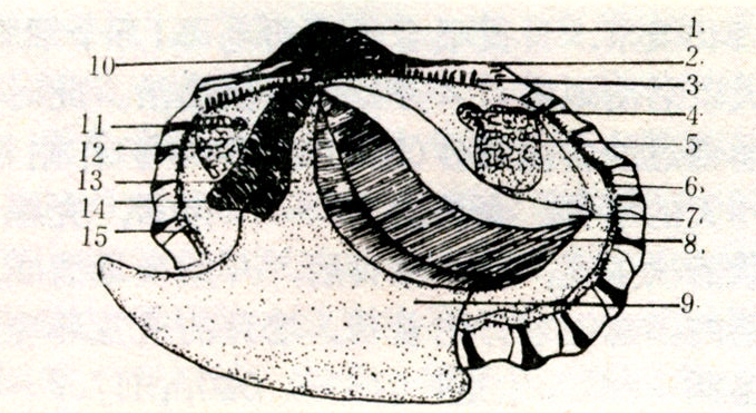 形态构造 贝壳较厚,呈卵圆形。放射肋粗壮,约18~21条,肋上具明显的颗粒状结节。壳顶突出,壳表白色,被褐色薄皮,韧带角质,黑色(图1)。铰合部直,齿细密。个体较小,一般壳长3~4厘米,在泰国,有的壳长达7~8厘米。外套膜左右对称,除在背部愈合外,其余全部游离。分三层,内层发达,边缘呈波纹状。后闭壳肌大,前闭壳肌小。足呈斧刃状,肥大。鳃位于足部的两侧,具呼吸和滤食功能。消化系统由口、上下唇、内外唇瓣、食道、胃、胃楯、肠、直肠、肛门构成(图2)。泥蚶血液含血红素,呈红色。