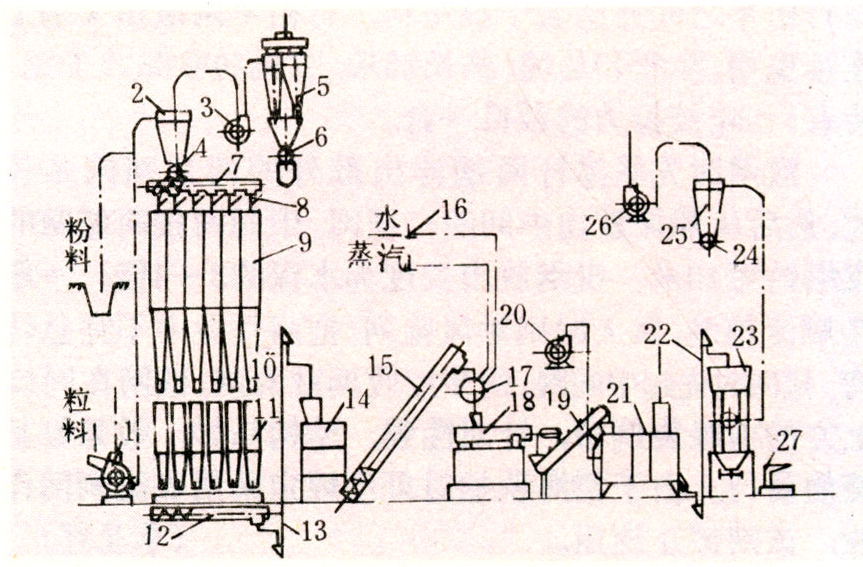 成套加工设备由粉碎、输送、称量、混合、膨化造粒、冷却、包装和集尘系统等组成(图1)。膨化机是成套加工设备的主机,其中螺杆、套筒是主要部件。它决定生产性能、产品特性和能量的利用效率等。螺杆、套筒采用喷涂或喷焊钴钛镍合金表面处理,使用寿命一般在1500小时左右。