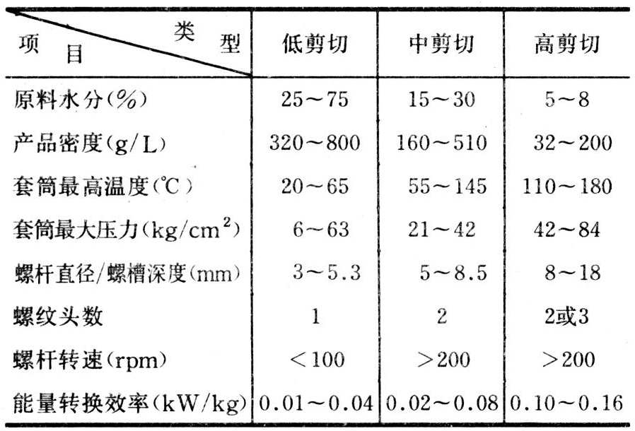 螺杆在一个端部装有模头的套筒内旋转。原料受螺旋片的泵压作用,因模板阻力而使物料受挤压、摩擦、剪切,料温、料压上升。物料从粉末状态被挤压、捏和成面团状,直到充分蒸煮成粘流状。经过了三种状态的变化,完成一个挤压蒸煮加工过程。不同的产品需要不同的蒸煮条件。按照挤压过程中粘性剪切率的大小,可分成高剪切、中剪切和低剪切三类膨化机(见表)。