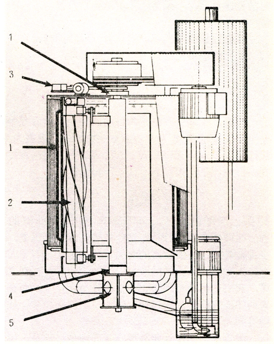 全套设备由片冰机和制冷系统两部分组成。其中片冰机主要由结冰圆筒、轧冰刀、传动、淋水系统及隔热层组成。结冰圆筒是机器的主要工作部件,可由不锈钢或碳素钢板外喷涂硬质合金制成。圆筒体为中空结构,致冷剂从圆筒的端轴进入夹层,又从连接于端轴外的密封箱通道内回气至压缩机。结冰圆筒卧放、半浸没于水箱中的,称卧式片冰机;立放、并依靠机内水泵供水,经供水管和喷头洒淋其表面的,称立式片冰机。低温制冷剂由液泵或重力供液,经分配器送入结冰圆筒,并在其夹层螺旋形槽内呈环状流动,不断吸收水中的热量,使圆筒表面的水迅速冷却结冰,形成冰层。圆筒或冰刀不断旋转,将冰切碎成片状后落入出冰斜槽,经出冰口连续送出机外。立式片冰机的结构见图。其上部为减速传动器,下端为供液回气密封装置,中间为垂直布置的结冰圆筒和螺旋轧冰刀。在结冰圆筒的上方为机内供水的淋水管,机器的外围为隔热体。机内水箱的水需预冷至2~6℃。水箱的水位可自动调节和控制,操作时只要先开机淋水约3~5分钟,待水冷却后再开动结冰圆筒或冰刀,便开始产冰。