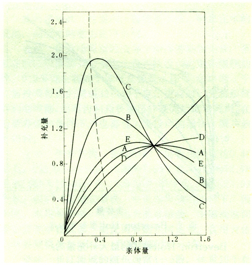 适合Ricker型关系的补充曲线如图1。图中曲线与对角线相截的点是种群平衡状态下亲体与补充量的水平,虚线表示最大持续产量轨迹,在同一补充体制下可以有不少不同的曲线。