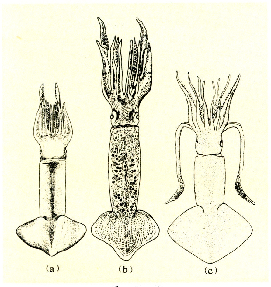 形态特征 体左右对称,分为头、足和胴部。头部两侧眼较大,眼眶外不具膜。头部和口周具10只腕,其中4对较短,腕上具2行吸盘,吸盘角质环具齿,雄性右侧、左侧第四只腕或左右第四只腕茎化,成为生殖腕;另一对腕较长,为触腕,顶部为触腕穗,穗上具4~8行吸盘。胴部圆锥形,狭而长,肉鳍短,分列于胴部两侧后端,两鳍相接略呈横菱形。内壳角质,多呈狭条形,薄而透明,末端形成中空的尾椎。有的种类具发光器,位于皮下或直肠附近。(见图)