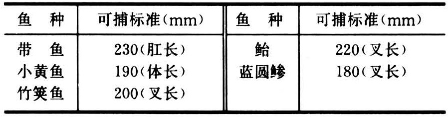 生物学最小型是以保护幼鱼资源为目的,在欧洲的底层鱼渔业中很早就采用,并且大都和网目大小的限制并用。1946年国际防止鱼类滥捕会议上制定(1953年生效)的条约中规定:未达到最小捕捞规格的幼鱼禁止在船内保存和海上丢弃。国际间的渔业协定都对保护对象的可捕标准作出明确规定。如中国和日本的渔业协定对下列鱼种的可捕标准规定如下表。