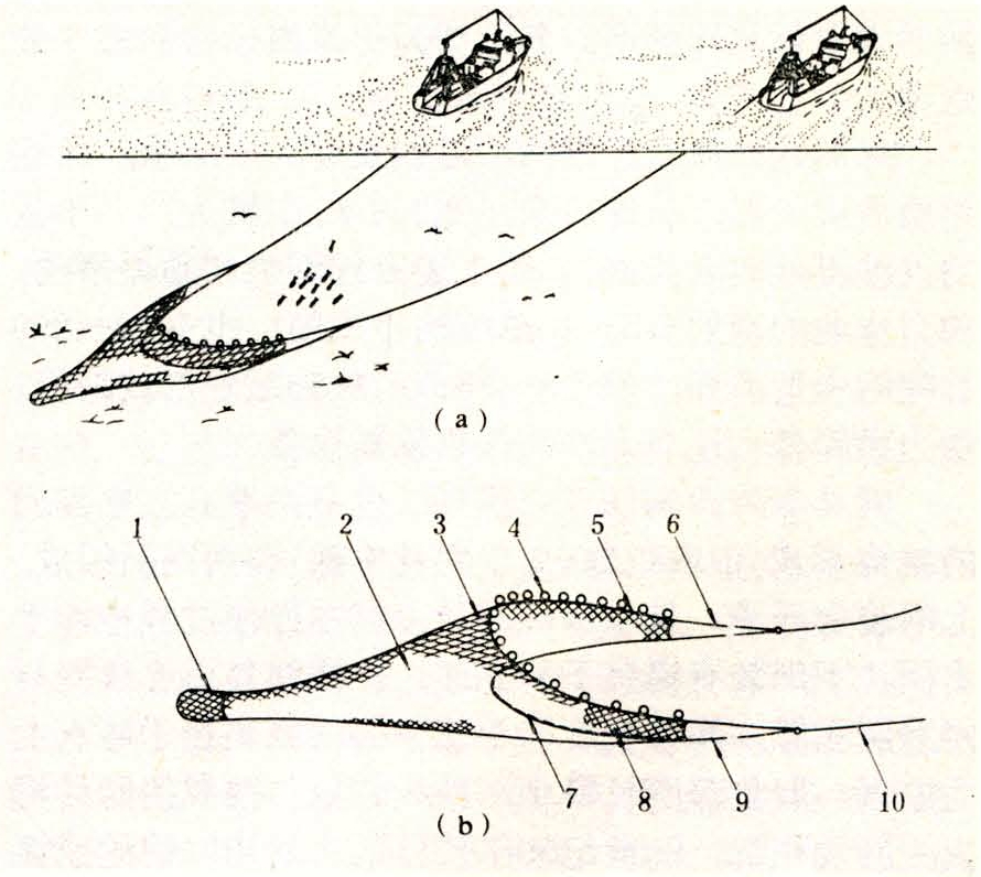 根据渔船甲板布置特点,双船拖网作业可分前甲板和后甲板操作(包括尾滑道操作)两种方式。20世纪50年代以前主要用前甲板操作方式,60年代后除小型渔船外,多数已采用后甲板操作方式。两种操作方式的起、放网过程基本相似。渔船到达渔场后,先由放网船投出网囊,当网具全部下水并在海面正常张开后,带网船向放网船靠拢,将曳纲一端送给放网船,然后两船各向外转45°快速航行松放曳纲(放出长度约为作业水深的10~15倍),曳纲放完后,两船按预定拖向和一定的拖速转向平行拖曳。拖曳时间一般为2~3小时。起网时,两船靠拢,带网船将曳纲另一端送回放网船,由放网船收绞两曳纲。两网袖绞上甲板后,用吊杆或龙门架上的起吊设备将网身逐段吊上甲板,最后把网囊吊进或通过滑道拖上甲板(见图)。
