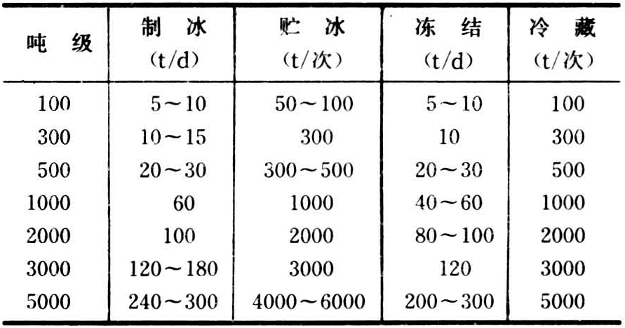 按渔业生产年上岸量和鱼汛高产期月平均上岸量确定好鲜鱼分配比例后,制定各项生产能力配比。建在渔港的生产性水产冷藏库,其一般配比见表。建在城市的供销性冷藏库,一般不建制冰池和贮冰间,冻结能力也只有生产性冷藏库的一半。零售用冷藏库无冻结设备,有的只有用装配式隔热板做的保温库,冷藏吨位较小。