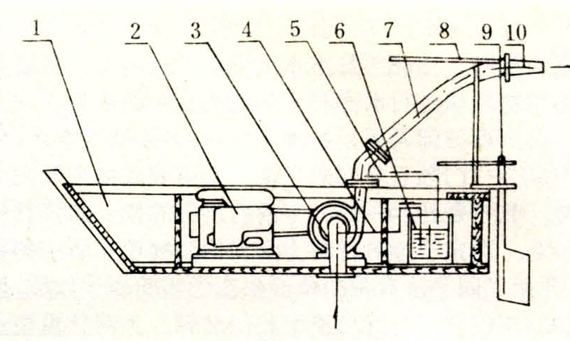 主要用于向养殖水面喷洒液状饲料。它由杂质泵、料斗、输料管道、喷射器等组成(图1)。杂质泵用于从池中吸入清水,料斗用于储放液状饲料,喷射器用于将饲料洒向养殖水面。整套设备装在船上的称为喷浆船;装在车上的称喷浆机;直接固定在鱼池周围的称喷浆设施。