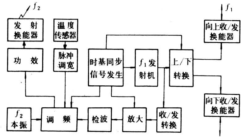由检测发射器和接收指示器两部分组成。检测发射器就像一架装在网口上的不带记录器的水密探鱼仪。它把探测到的网情、鱼情信号经处理后,加上同步信号一起用超声波发送给作业船,由船上的接收指示器同步显示。其原理见图。为监测拖网上方与下方网情、鱼情,分别朝上、朝下安装两只频率为f1的高频换能器,分别向上向下发射并接收超声脉冲,犹如两台垂直探鱼仪,但发射接收电路公用。接收回波经放大检波处理后,连同同步信号一起调制另一个f2低频传递信号。一般采用调频制,以提高抗干扰能力。调制后的f2信号,经功率放大后由f2换能器变成超声波发送给船上的接收换能器。有时为掌握鱼群栖息水层的水温信息,可在发射器内装温度传感器,一并发出脉冲调宽水温信息。船上的接收换能器一般通过几十米短电缆安装在水平舵上,放入水下几米深处,以保证良好的声信号接收。为了操作方便,有的在船底安装一组宽指向换能器组,船上接收并检出到的网情、鱼情及水温信号,由显示器或记录器指示。无线式拖网监测仪与有线式相比,体积小,起放网方便,适合各种拖网作业渔船使用。但由于海况、风、流等影响及缠绕偏差和航向改变等,拖网不能经常精确对准船尾,因而信息传递的稳定性不如有线式好。(陈艮)