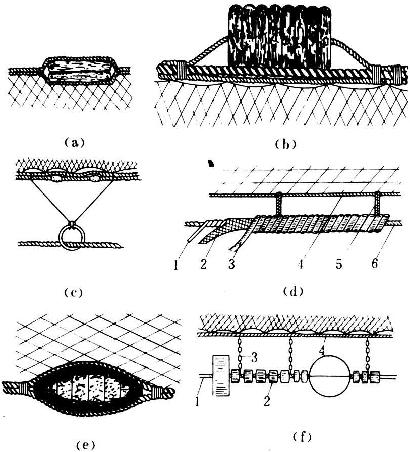 为使网具保持一定的作业形状和达到作业要求,分别装配浮子、沉子、挡杆或底环等属具。浮子、沉子的主要装配方式是将其夹入、穿入或直接结缚在浮、沉子纲上(图a、b、c、d)。拖网的沉子纲有的用钢丝绳外包布条、旧网衣和绳股制作,或者将钢丝绳穿入橡胶、塑料滚轮制成。再用吊纲(链)或通过水扣绳与下缘纲相连(图e、f)。