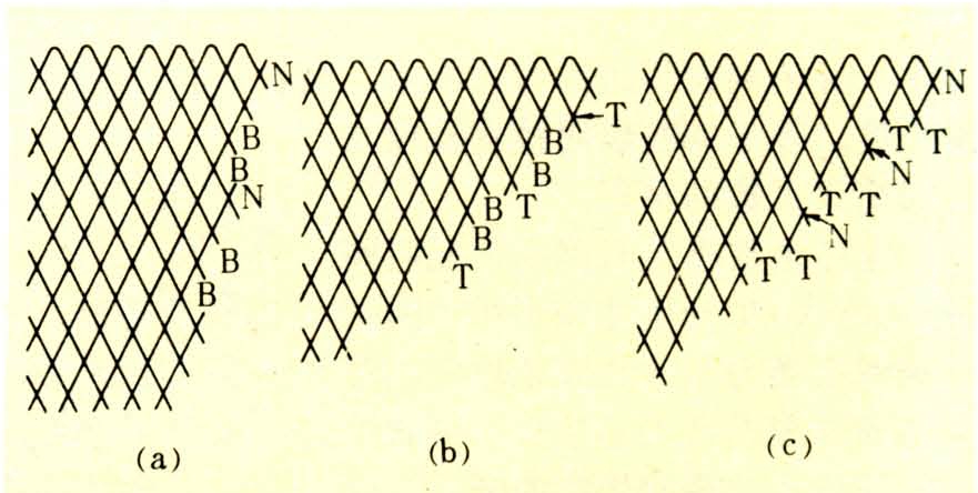 为使边旁和单脚混合剪裁达到对称,其必要条件是开剪为一个边旁(N),终剪为一个单脚(B);中间的边旁和单脚要排列成对称形式。为使宕眼和单脚混合剪裁达到对称,其必要条件是开剪为一个边旁(N),终剪为3个单脚(3B),中间的宕眼和单脚排列成对称形式。