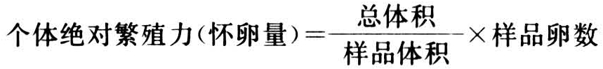 ②体积法。将卵巢内全部卵粒分离,放入容器内水中,使其均匀分散,测量总体积,取出其中部分体积作为样品计数卵量。计算公式为: