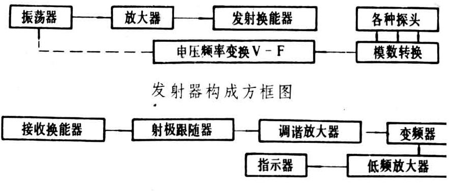 运用超声波跟踪鱼类洄游的装置。中国于1981年运用水下超声波跟踪设备进行了鱼类跟踪试验。水下超声跟踪装置是由结缚在鱼体上的超声波发射器和装在跟踪探索船上的超声波接收指示器两部分组成。其工作原理是由鱼体携带的超声波发射器产生的超声波脉冲电信号,经换能器转换成超声脉冲波在水中发射。跟踪探索船的船底装有接收换能器,把接收到的声脉冲信号转换成电信号,经过噪声抑制、变频、放大驱动显示记录和监听。各构成见图。发射器的顶端为环状压电陶瓷换能器,水密抗压的外壳内装有各电路板,外径为20毫米,长度为60毫米,水中重量为11克。电源采用高能化学电池,工作频率为20~30千赫。接收指示器由电子电路控制接收换能器阵,自动搜索扫描跟踪鱼类。来自发射器的信号经处理放大后,驱动荧光屏,显示方位,并以音响监听跟踪鱼类目标。