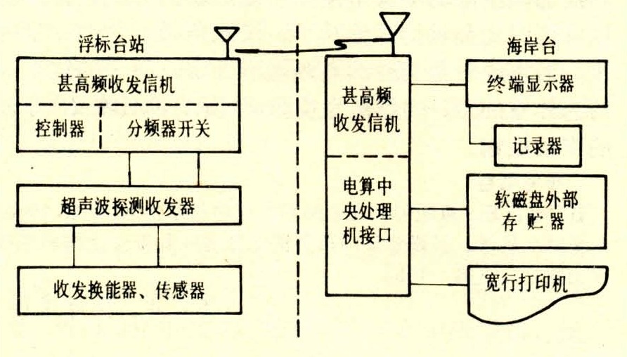 甚高频收发信机采用42.68兆赫同频工作。接收为超外差方式,中频为10.7兆赫;发射机采用调频调制方法,海岸台对浮标台站指令调制频率范围为350~1000赫间更换音频,浮标台站用不同音调可识别或选择多达三个浮标台站,在350~1000赫之间用四种频率,其中三种作识别或选择用,第四种作停止浮标台站发射用。超声波发射器由浮标台站甚高频收发信机控制工作,输出功率约10瓦,脉冲间歇700毫秒,脉冲宽度10毫秒,工作频率50千赫。浮标台站电源采用高能化学电池、太阳能电池。