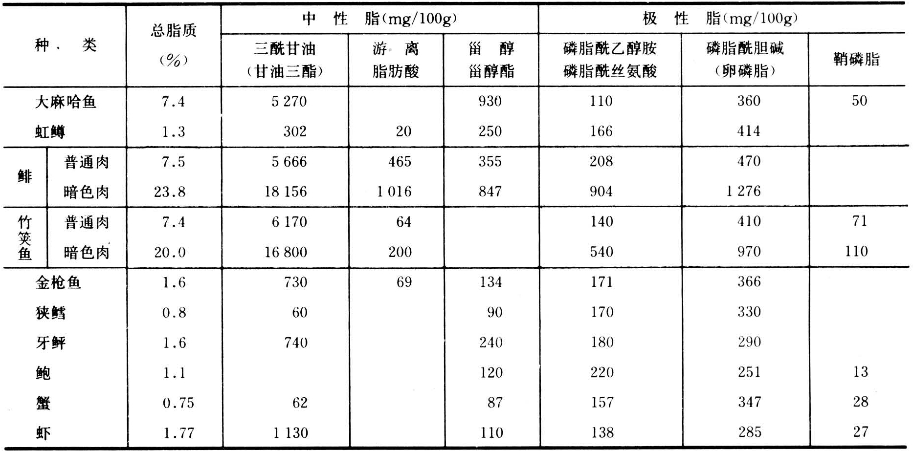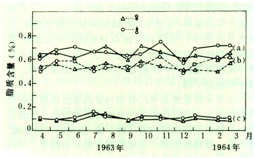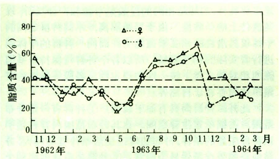 鱼类和其他水产动物脂质的种类和含量因种类而异。鱼体组织的脂质种类主要有三酰甘油(亦称甘油三酯)、磷脂、蜡脂以及不皂化物中的固醇(甾醇)、烃类、甘油醚等。鱼类肌肉中的脂质含量,少的低于1%,主要为运动性不强的底栖鱼类;多的可以达到30%以上,多为运动性强的中上层洄游性鱼类。因此有少脂鱼与多脂鱼之分。脂质在鱼类和水产动物体组织中的种类数量分布,还和脂质在体内的生理功能分不开。存在于细胞组织中具有特殊生理功能的磷脂和固醇等所谓组织脂质,无论是在多脂鱼类或者少脂鱼类(也包括各种水产动物体)肌肉中的含量基本是一定的,约在0.5%~1.5%范围(见表)。多脂鱼肉中的大量脂质主要为三酰甘油,是作为能源的贮藏物质而存在的,一般称为贮藏脂质,在饵料多的季节,含量增加,在饵料少或者产卵洄游季节即被消耗而减少。此外,一些少脂鱼类,肌肉中的贮藏脂质不多,但却大量贮存在肝脏或者腹腔。如鲨、鳕、马面鲀等肝中的肝脏油和鲤、鲢、草鱼等多数鲤科鱼类腹腔的脂肪块部是贮藏脂质,数量多,并随季节等而增减变化。如图1、图3中的■肌肉脂质和鳕肝油的季节变化,显示了贮藏脂质的特点,而图2中的鳕肌肉脂质则显示了组织脂质无季节变化的特点。鱼类肌肉组织中脂质含量分布,因性别、年龄以及部位不同而有差别。一般年龄大、体型大的脂肪含量高;腹肉中的含量高于背肉;养殖鱼高于野生鱼。图1中可以看到这种情况。鲸、海豚等温血动物的皮下脂肪层特别厚,这和保持体温有关。深海鱼类脂质中烃类含量高。