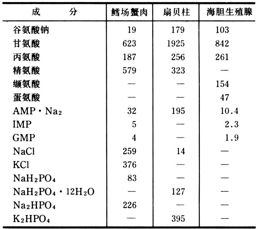 一般认为某种鱼类或虾蟹、贝类所具有的固有味道,是由它的肌肉提取物中各种呈味成分综合作用的结果。因此,对某种鱼贝类的肌肉提取物进行全面分析,然后按分析结果所知道的呈味成分种类,用同样的化合物进行人工配合,即有可能得到具有与天然味道相同的人工合成肌肉提取液。为了搞清楚提取液中呈味成分的种类,一般采用删减法。即在配制的人工提取液中逐步删减一种成分,用感官评味方法确定其对整体味道的影响。通过这种方法,既可知道每种成分在该合成提取液中有无呈味作用,又可以全面确定一种水产品肌肉提取物味道在整体上是由哪些呈味成分组成的。下表是鳕场蟹肉、扇贝柱和海胆生殖腺人工合成提取液中主要呈味成分的种类与数量。