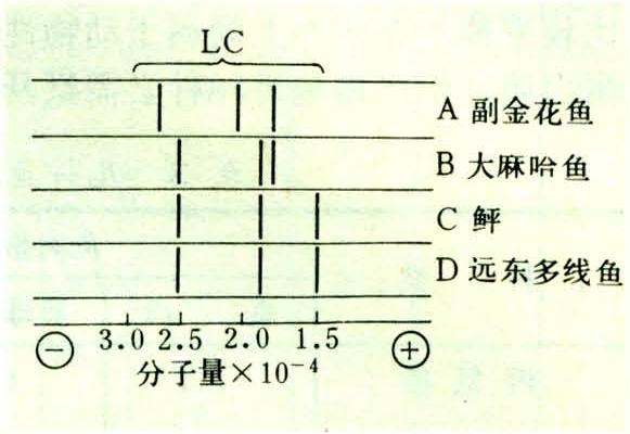 由肌球蛋白、肌动蛋白以及称为调节蛋白的原肌球蛋白与肌钙蛋白所组成。肌球蛋白和肌动球蛋白是构成肌原纤维粗丝与细丝的主要成分(见鱼类组织)。两者在ATP的存在下形成肌动球蛋白,与肌肉的收缩和死后僵硬有关。肌球蛋白的分子量约为5.0×105,肌动蛋白约为4.5×104,是肌原纤维蛋白的主要成分。其他属于调节蛋白的原肌球蛋白等数量较少,与加工贮藏中鱼肉质量变化的关系不大。肌球蛋白分子由重链与轻链两个部分所组成,每一肌球蛋白分子上有3根或2根(白色肉为3根,暗色肉为2根)分子量不同的轻链。将从肌肉制备的肌原纤维用SDS-PAG(十二烷基硫酸钠—聚丙烯酰胺)凝胶电泳进行分离测定,可以看到按分子量大小次序排列的肌原纤维蛋白组分的电泳谱(图1)。不同鱼类的3根轻链的分子量大小不尽相同,但对于同一鱼种是一定的(图2,表2)。利用这种轻链的种特异性可以进行鱼种分类的鉴别。作为肌球蛋白和肌动蛋白的重要生物活性之一,是它具有分解腺苷三磷酸(ATP)的酶活性,是一种盐溶性蛋白。当两种蛋白质在冻藏、加热过程中产生变性时,会导致ATP酶活性的降低或消失。同时,肌球蛋白在盐类溶液中的溶解度降低。这两种性质是用于判断肌肉蛋白变性的重要指标。在鱼糜制品加工过程中加2.5%~3%的食盐进行擂溃的作用,主要是利用氯化钠溶液从被擂溃破坏的肌原纤维细胞溶解出肌动球蛋白使之形成弹性凝胶。此外,在贝类、乌贼等无脊椎动物肌肉的肌原纤维蛋白中还存在一科副肌球蛋白,分子量约1.0×105,与肌球蛋白共同构成肌原纤维的粗丝,其与贝类闭壳肌的收缩作用有关。