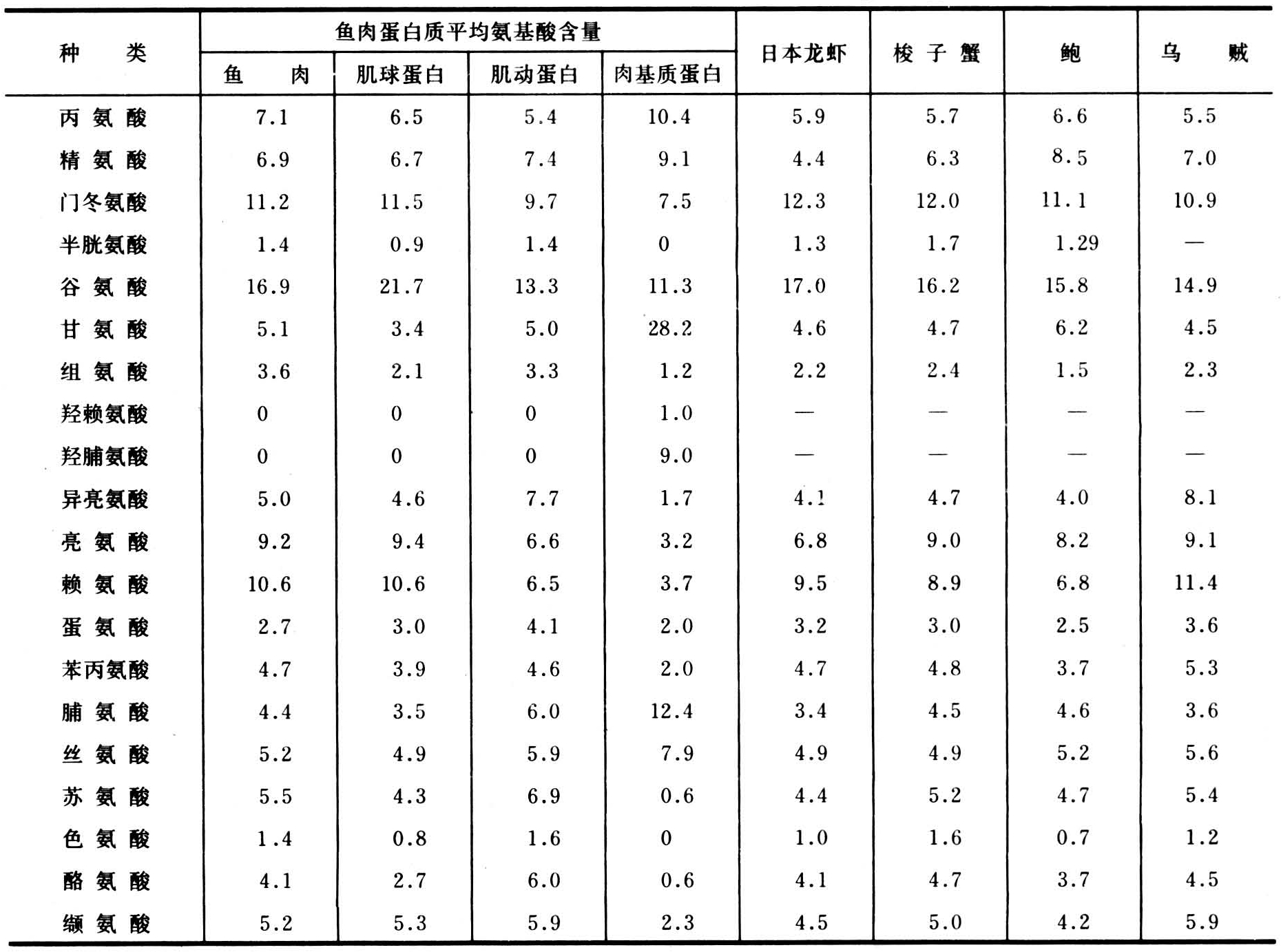 小的蛋白质,称肌浆蛋白:以及构成结缔组织的肉基质蛋白。这几种蛋白质在鱼类等水产动物和禽畜等陆产动物中的种类组成基本相同,但数量组成上存在差别。一般鱼类等水产动物肌肉的结缔组织较少,因此肉基质蛋白的含量也少,约占肌肉蛋白质总量的2%~5%(鲨、鳐等软骨鱼类稍多,见表1)。某些贝类、螺类等的肉基质蛋白含量高于鱼类,有的组织含量多达10%~40%。