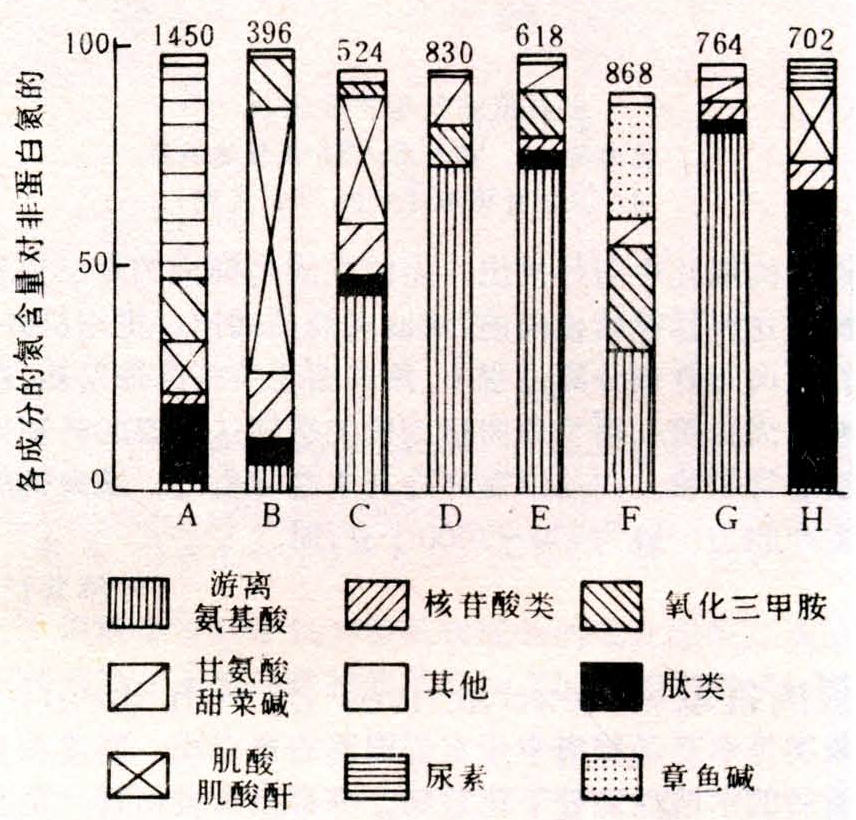 鱼类和其他水产动物肌肉提取物的种类分布特点如图所示。图中纵座标为8种主要提取物氮对非蛋白氮(NPN)的%,从中可以看到这些含氮提取物在8种水产动物肉中的分布特点:①代表板鳃类的鼠鲨肌肉提取物中含量最高的是尿素,约占NPN的50%。其次是低分子肽(主要是鹅肌肽)。TMAO和核苷酸、游离氨基酸含量极少。②属于底层鱼类的真鲷提取物中含量最多的是肌酸(包括肌酸酐),超过50%。其次是核苷酸类和TMAO。游离氨基酸含量不多。③中上层鱼类的鲐鱼肌肉中,含量最多的是游离氨基酸(主要是组氨酸),接近NPN量的50%。其次是肌酸。④虾、蟹、贝类中的对虾、鳕场蟹和扇贝肉中的游离氨基酸量占优势,为NPN量的70%~80%。这是因为它含有大量的甘氨酸、脯氨酸、丙氨酸和精氨酸(扇贝中并含有较多的谷氨酸)。此外,还含有一定数量的甜菜碱和TMAO(对虾和鳕场蟹)、核苷酸(扇贝)。⑤软体动物头足类的枪乌贼中含量最多的是游离氨基酸、章鱼碱和TMAO。此外还有较多的甜菜碱。⑥鲸类的鳁鲸肌肉中约含70%的低分子肽,其中90%为鲸肌肽。其次是肌酸,并含有一定数量核苷酸。图中的对虾和枪乌贼的核苷酸未测定计入。