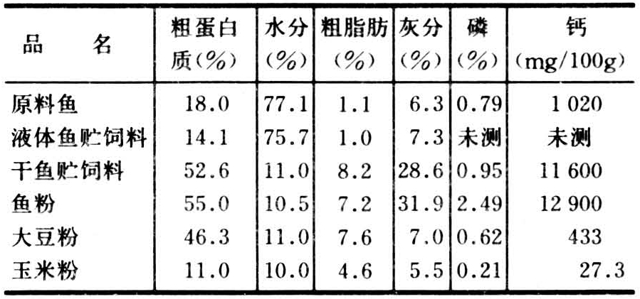 液化成熟后的鱼贮饲料呈酱状的,称为液体鱼贮饲料,用作畜禽和鱼虾等的饲料添加剂,掺入其他植物性饲料搭配使用;在液体鱼贮饲料中加入玉米粉、麸皮、米糠等其他植物性粉状饲料,拌和干燥,使水分降至40%~50%,便于运输贮藏,称为干鱼贮饲料。将液体鱼贮饲料蒸发浓缩,使干物量达到40%~50%,称为浓缩鱼贮饲料。和鱼粉相比,鱼贮饲料较好地保存了鱼体原有的蛋白质和热处理中容易破坏的维生素等营养成分,具有良好的营养价值。下表是用同一种鱼类原料所生产的鱼贮饲料和鱼粉、大豆粉、玉米粉等的化学组成比较。