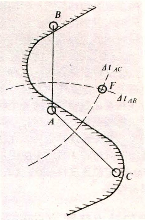 利用测定两个或两个以上劳兰台对所发射的脉冲信号到达船舶的时间差确定船位。属于脉冲双曲线导航系统。有劳兰-A和劳兰-C两种:①劳兰-A。由两个发射台为一对,一个为主台,另一个为副台,主台控制副台,副台在接收到主台脉冲后,经过一定时间的延迟,再发射副台脉冲,必须有两条或两条以上的船位线相交,才能确定船位,故需建立两对或两对以上主副台(图2)。当劳兰-A接收机接收到A、B两台发射的脉冲信号后,精确测定两个发射台脉冲信号到达接收机的时间差△tAB,得一条相应的位置线,再测A、C两个发射台的脉冲信号到达接收机的时间差△tAC,得另一条位置线,两条位置线相交的交点F即为船位。劳兰-A的工作频率可分1950、1850、1900和1750千赫四种。为避免众多的发射台使用相同的频率,所以采取改变脉冲重复频率的方法来区别各台对。脉冲重复频率分S、L、H三种基本脉冲重复频率和0~7共8个数字排列组合的特殊脉冲频率。白天地波作用距离为700海里,主要工作区定位精度为1海里。夜间利用天波,作用距离为1400海里,但定位精度下降,使用天波时,必须经过天波修正才能获得准确船位。由于劳兰-A定位精度不高,80年代以来逐渐由劳兰-C所代替。②劳兰-C。在劳兰-A的基础上发展起来的脉冲相位距离差双曲线导航系统。它不但能测定主台和副台发射的信号时差,而且还能测定信号的相位差。工作频率为100千赫,地波作用距离白天1200海里,夜间约1000海里,使用天波不论日夜均达2000海里。定位精度达1/4海里。劳兰-C的基本重复频率除有与劳兰-A相同的S、L、H外,还有SSSL、SH。每个台链有3~5个台组成。各台用同一脉冲重复频率发射,所以只要选择一个脉冲重复频率就能求得多条位置线,接收操作较为简便。此外,劳兰-C采用多脉冲体制发射脉冲,主、副台分别由9个和8个脉冲组成,以示区别。