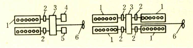 通常以双机单桨较多,也有四机单桨的。以两台同型号同功率的柴油机,分别通过弹性联轴节经一减速齿轮箱并机,传动一定距桨或调距桨。齿轮箱还可设辅助输出轴,以拖动发电机或捕捞设备用的动力设备。其系统见图3。主要优点是:①双机并用可获得最大的自由航速。将一台柴油机与齿轮箱脱开,只用一台柴油机供部分负荷工况用,可按接近其额定功率的经济工况运行,故能较好地解决渔船部分负荷运行的经济性问题。②航行安全性好。一台主机发生故障,可以另一台主机获得相当全速3/4左右的航速安全返航。③若用调距桨还可提高部分负荷时的推进效率。主要缺点是机舱要有一定宽度;装置较复杂,造价较高;传动效率比柴油机直接联结螺旋桨的动力装置低5%左右;对于用定距桨的装置,操纵性和微速推进仍不能完全解决。