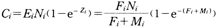 式中 将年渔获量全部当作年中瞬时捕捞来处理。若M和Ci为已知,只要估算出Ni+1,就可简易地连续计算出Ni,Ni-1,Ni-2,……。在给出每年初残存尾数后,就能计算出年残存率和捕捞死亡系数,由此能求得所有其他参数。实践表明,当M≤0.3和Fi≤1.2时,该方程的近似值相当准确。