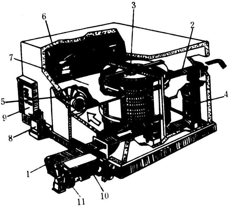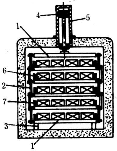 产品直接与蒸发器的板面接触。大致可分钢带式、平板式(包括卧式、立式、自动式平板冻结器)和圆筒回转式冻结器三类。大多采用制冷剂直接蒸发,以液泵循环供液。①钢带式冻结器:它装有一条厚度为1毫米的不锈钢输送带,带的内侧喷淋-35~-40℃的氯化钙盐水或丙二醇溶液,可将薄片状或小形水产品直接排贴于钢带表面进行冻结。②平板冻结器:主要构件是金属制的冻结平板和液压构件等。金属平板一般为铝合金材质,如用钢质的易被腐蚀。平板厚度通常为22~32毫米,中间为制冷剂通道。由11~19块平板组合成套,水平安装,形成一层层搁架,称为卧式平板冻结器(图2)。也可将平板垂直安装,下方、前方,后方加挡板,形成一格格的箱状空间,称为立式平板冻结器。平板与平板间的间距可以调节。操作时,可借液压机构施加0.07~0.3千克/厘米2的压力,使平板紧贴被冻产品。立式平板冻结器主要用作冻结散装水产品,广泛用于海上冻结整条鱼。平板冻结装置的占地面积小,冻结速度快,冻品干耗少,电耗比吹风式冻结省30%,工人可在常温条件下操作,但大多用手工操作,劳动强度大。除上述两种平板冻结器外,还有一种连续式平板冻结器,装有61块平板,安装成辐射状,旋转一周,完成一个冻结过程,可连续操作,日产量可达30吨。③转筒式冻结器:为一直径1.5米左右的圆形转筒,通过液泵将-35~-45℃的载冷剂经转动空心轴输入转筒。转速可调节,以适应不同产品所需的最宜冻结时间。被冻水产品排放在转筒表面,直接接触转筒,每转一圈被冻产品就被刮刀铲下。这种装置适于冻结鱼片、虾、鱼糜片等水产品。