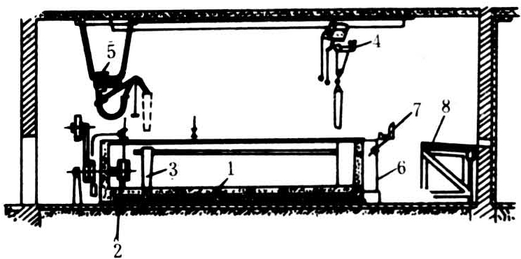 采用盐水为中间介质,冰桶中灌入淡水后浸入盐水中制冰(见图)。①制冰池一般用6~8毫米厚的钢板焊接成长方形水箱,深度约比冰桶高20厘米左右。蒸发器通常靠边侧安装,并用隔板将它封在池边,形成大小两个池子。隔板的两端侧面开有孔,使大池与小池相互沟通。大池沿口焊有角铁制的阁架,用以搁置冰桶架和木盖板。池底和四周均敷贴软木砖等隔热层,厚度为200~250毫米,以减少从外部传入冰池的热量。冰池底下设置机械或自然对流通风道,以防止冰池下面的土层冻结。冰池的箱壁、蒸发器和搅拌器等表面都必须涂上防锈漆,以减少盐水对设备的腐蚀。②蒸发器安装于冰池内靠长边一侧狭窄的通道内。氨液经膨胀阀进入蒸发器,吸收盐水中的热量后蒸发为气体,盐水被冷却并保持在-10℃左右低温。蒸发器的形式有排管式、立管式、螺旋管式和Ⅴ形管式。其中Ⅴ形管式和螺旋管式应用较广。③搅拌器的作用是使盐水作循环流动,将冰桶中水的热量传递给蒸发器。搅拌器有卧式和立式两种。卧式搅拌器安装于冰池顶端的侧壁上,靠螺旋桨的推动使盐水流动;立式搅拌器安装于冰池顶端的池面上,靠斗形外壳内叶轮转动使盐水流动。④冰桶用1.5~2毫米厚的钢板焊接成上口大、下口小的矩形断面容器,用来盛淡水制冰。⑤冰桶架用75毫米扁钢焊成框架,用来插置冰桶,便于成批吊装。⑥溶冰池设于冰池的一端,用钢板焊制或用混凝土浇注而成。池内有流动的常温水,冰桶在倒冰前先吊入溶冰池内加热,使冰表面融化而同冰桶脱开。⑦倒冰架为木质,用以装入成排冰桶,木架可绕左右两个支承旋转而倾倒。为控制倒冰速度,后端装有平衡锤。⑧加水装置是一种容积式定量装置。水箱内用钢板隔成数量同一排冰桶数相等的间隔,每隔的容量就是一只冰桶的要求加水量。水箱内装有溢流管,保证冰箱注水不会超过定量。⑨吊车是一种桥式吊运设备,用于完成融冰、倒冰、加水等操作。