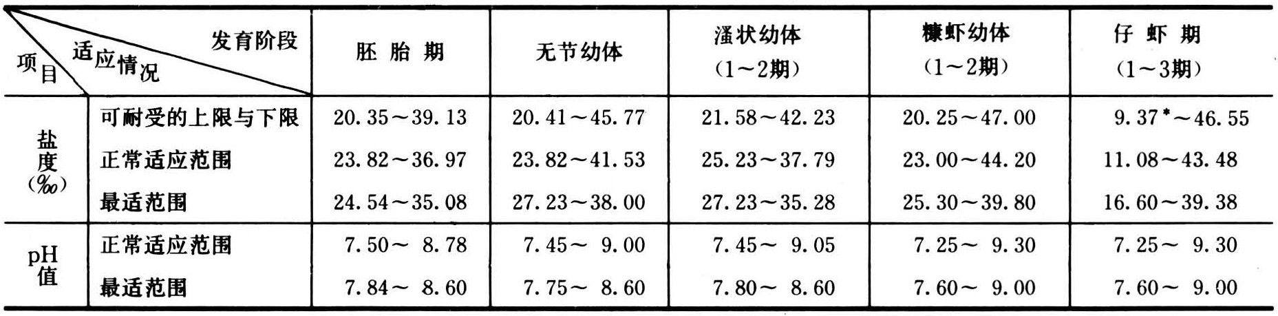中国对虾是狭pH值性生物,适宜范围为7.8~9.3;中国对虾是广盐性生物,在盐度2‰~40‰(渐变幅度)的海水和半咸水中均可生活,但盐度突然变化,则难以适应。