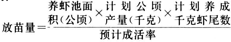 放养量适宜与否直接关系到对虾养殖的产量和质量,应根据虾池条件、水交换能力、饵料种类和供应情况等来确定合理放苗密度。中国土池养殖一般放苗密度为9万~18万尾/公顷,0.67公顷以下的养虾池放苗密度可为22.5万~45万尾/公顷,计算公式为。