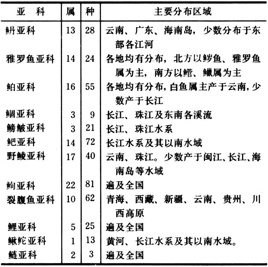 鳅科鱼类也是分布较广泛的一种,以长江和珠江分布最多,其次是黄河。鲟科不入海的黑龙江鳇鱼及施氏鲟产于黑龙江水系,达氏鲟产于长江,西伯利亚鲟及小体鲟产于额尔齐斯河,裸腹鲟产于伊犁河。鳀科中不入海的短颌鲚仅产于长江水系。鲑科不入海的有8种,分布于黑龙江、绥芬河、图们江、鸭绿江、额尔齐斯河;本科的虎嘉鱼则分布在四川省的岷江、大渡河、嘉陵江,在汉江及其支流也有分布。茴鱼科只见于黑龙江水系、鸭绿江及额尔齐斯河。胡瓜鱼科的池沼公鱼分布于黑龙江、图们江和鸭绿江。狗鱼科有黑斑狗鱼和白斑狗鱼两种,前者分布于黑龙江水系,后者分布于额尔齐斯河。胭脂鱼科和裸吻鱼科各一种,前者分布于长江及闽江水系,后者仅见于雅鲁藏布江下游。平鳍鳅科常见于珠江水系及海南岛。鲇科除青藏高原外各水系和地区均有分布。胡鲇科及钝头鲇科分布于长江以南各水系。科及粘鲇科仅分布于澜沧江水系,长臀鮠科仅产于西江水系、海南岛及云南的红河水系。鲿科鱼类北自黑龙江、南至海南均有分布,但主要分布于长江、闽江及钱塘江水系,其次为珠江;青藏及新疆地区则无分布。鮡科分布于长江水系及青藏高原。青鳉科仅分布于华南、华东及北方地区。鱵科仅产于长江中下游。鳕科仅1种,产于黑龙江、鸭绿江和额尔齐斯河。合鳃鱼科除青藏高原及黑龙江外,分布全国各水系。鮨科除在黑龙江水系、海南岛各有1种外,钱塘江、珠江有8种,长江和闽江水系有6种。鲈科仅见于新疆诸水系。溪鳢科仅产于台湾。塘鳢科及鰕虎鱼科的分布范围近似,从黑龙江至珠江以及陕西、云南、贵州、四川等地均有分布。攀鲈科仅1种分布在云南、广西、海南、台湾及福建。鳢科从黑龙江到云南均有分布,以南方较多。刺鳅科除刺鳅分布全国各水系外,另1种仅分布于长江流域以南。杜父鱼科的淡水种类产于黑龙江水系、图们江、鸭绿江和额尔齐斯河。