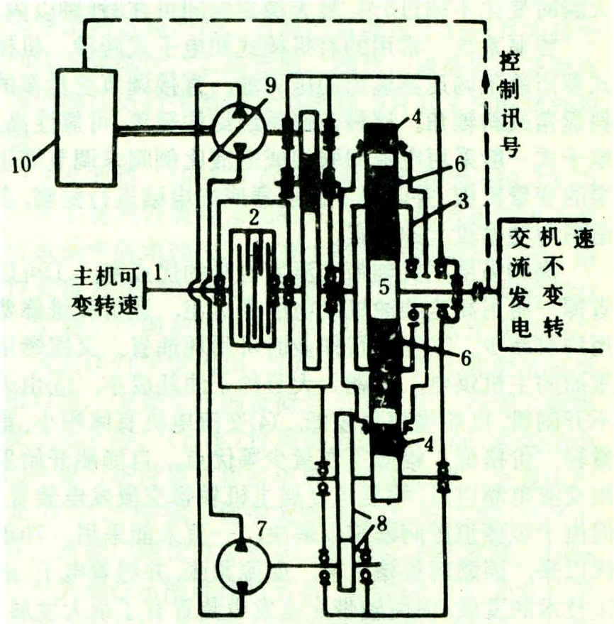 恒速齿轮装置结构如图1。主机输入轴经多片离合器传动行星齿轮箱的齿轮支架。其行星齿轮箱内齿圈并不固定在壳体上,且能正反转动。如果内齿圈固定不转动,则行星齿轮即成为一般的增速齿轮箱进行工作,此时在太阳轮处把输入转速转换成较高的输出转速。太阳轮与交流发电机相接。一般的设计,当主机转速为额定转速的85%时,经行星齿轮增速后,适与发电机的额定转速相对应,据此选择行星齿轮箱的速比。当主机转速低于85%转速时,则发电机转速亦将降低,这时就要使内齿圈转动,以便对太阳轮提供附加转速,使之恒定在发电机的额定转速,以保持发电频率不变。为了转动内齿圈,设有液压马达,能在正反两个方向转动,通过减速齿轮组与内齿圈联接。液压马达由变量液压泵驱动。另设有控制装置,随转速的变化,通过变量液压泵调节油马达的转向和转速,以获得发电机的恒频工作。