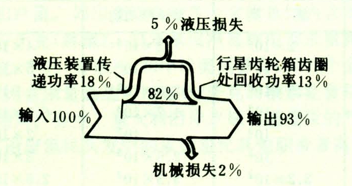 这种恒速稳频装置效率高,功率损失小。当柴油机转速为85%时,油马达不工作,全部功率均由机械传动,故能获得95%以上的最高效率。此时如用制动器将内齿圈刹住,则可再提高效率1%。主机转速为70%或100%时,部分功率是通过液压方式传递的,导致较大功率的损失。图2所示为最差工况的功率转换情况。