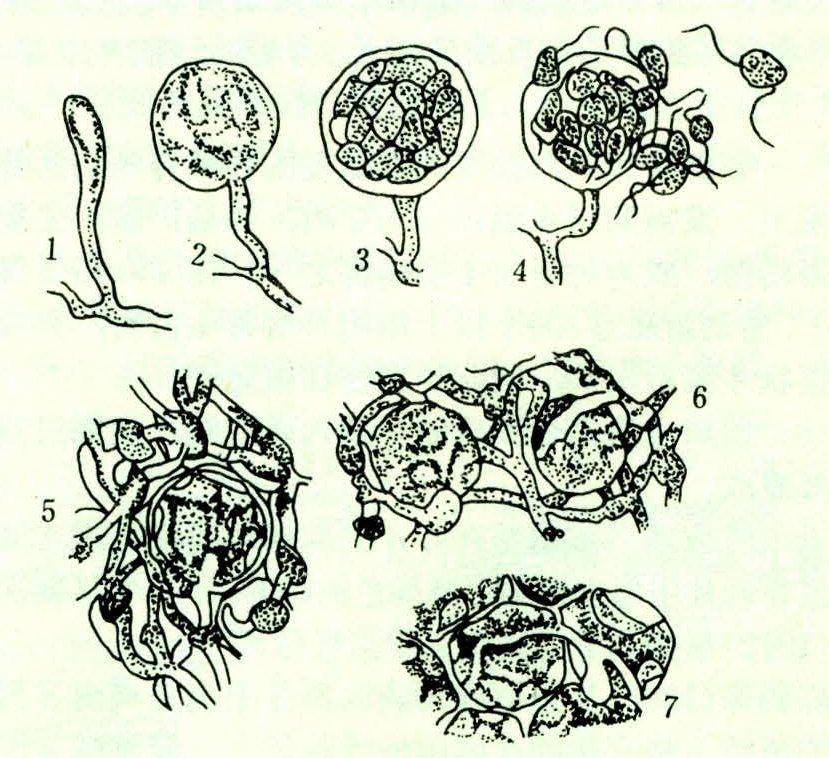 壶状菌体的大小随寄生细胞大小和寄生在一个细胞内菌体的数量而不同,一般直径为6~20微米,平均13微米。菌体形成游孢子囊,每个游孢子囊内产生32~128个游孢子,游孢子具有2条长短不等的鞭毛,通过伸到藻体外的放散管放出。孢子附着后呈圆形,直径2.5~3.5微米,伸出萌发管穿入细胞内。