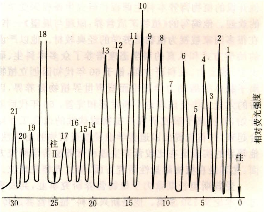 通常将氨基酸转化为具有荧光的DNS-氨基酸(是荧光试剂DNS-C1二甲基氨基萘磺酰氯与氨基酸结合成的衍生物),以荧光检测器测定氨基酸。下图是DNS-氨基酸高效液相色谱图,是用荧光检测器鉴定的。从图中可以看出,使用高效液相色谱法,结合荧光检测技术可以有效的分离及测定氨基酸。选择激发波长为340纳米,发射波长为510纳米。