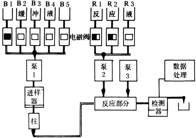 柱层析系统是整个仪器的心脏,由离子交换层析柱、洗脱缓冲液、泵、电磁阀或柱恒温水浴组成;显色系统由茚三酮缓冲液、泵、电磁阀、反应圈和反应水浴组成;检测系统由多波长光度计、流动б色槽和记录仪组成;程序控制和数据处理系统由微型计算机、数据处理机、操作键盘和打印机组成(见图)。
