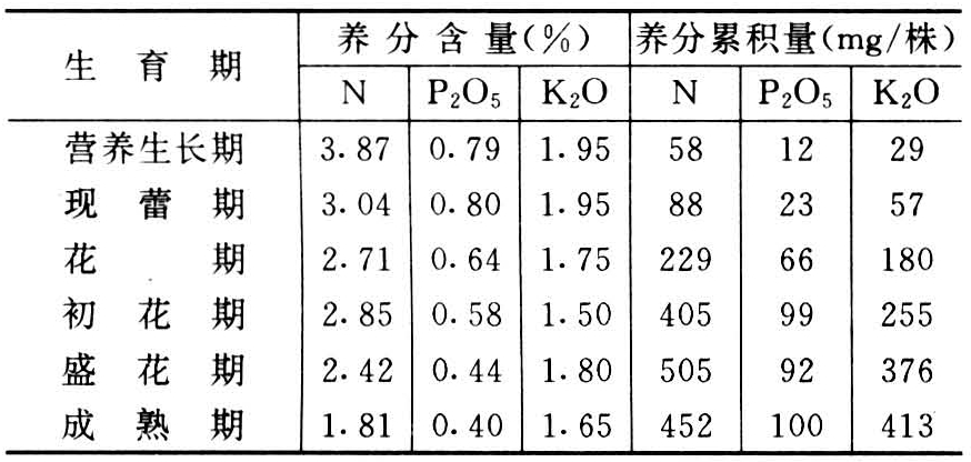 养分丰富、含量高。生长40~50天,地上部鲜物含氮(N)量约0.53%,磷(P2O5)0.08%,钾(K2O)0.31%。不同生育期以及不同部位养分含量亦不一样。其根、茎、叶的含氮量(以干物质计)分别为1.26%、1.18%和3.96%;P2O5 含量为0.23%、0.25%、0.66%,K2O的含量分别为1.34%、1.57%和1.10%。叶的氮磷含量较高,而茎钾的含量较高。氮、磷、钾养分含量随生长的进展而下降。其干物质积累随生长期延长而增加,养分总含量亦随干物质的增加而增加。盛花期养分积累量最高(见表)。其蛋白质和脂肪的含量随生长时间的增长而逐渐降低,在生长30天时,蛋白质和粗脂肪的含量分别为18.5%和3.0%,生长50天后,分别降至10.9%和1.63%。纤维含量、无氮浸出物却随生长时间的增长而增加,苗期30天粗纤维为28%,无氮浸出物为29.3%,50天以后,分别增加至29%和37.2%。作饲料用以初花期刈割营养成分最高。粗蛋白质含量以叶部最高,茎最少,粗脂肪含量叶最高,根最少。