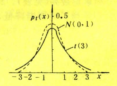 式中 π为3.14159…,v为自由度。t分布是随自由度v不同而变化的一组曲线,自由度较小时t分布曲线较标准正态分布曲线低矮离散,v愈大愈接近标准正态曲线;v→∞时,t分布逼近标准正态分布(见图)。t分布的平均数为0。曲线以t=0为中心左右对称,t定义域(-∞,∞)。实际上统计量t已被广义化,不一定限于上述定义,任何统计量只要它的密度函数符合p(t)要求都可以看作t分布。
