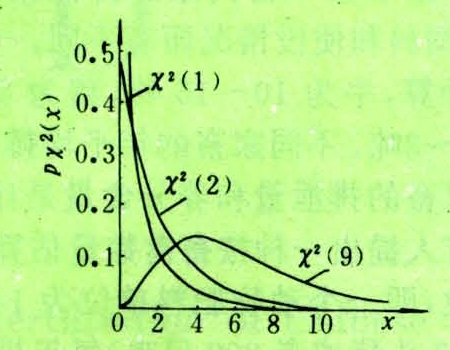 异的一组曲线,曲线倾斜,且随自由度减小倾斜度加剧。χ2的定义域为(0,∞)。实际上任一统计量只要其密度函数与p(χ2)相符都是具有χ2分布的统计量。