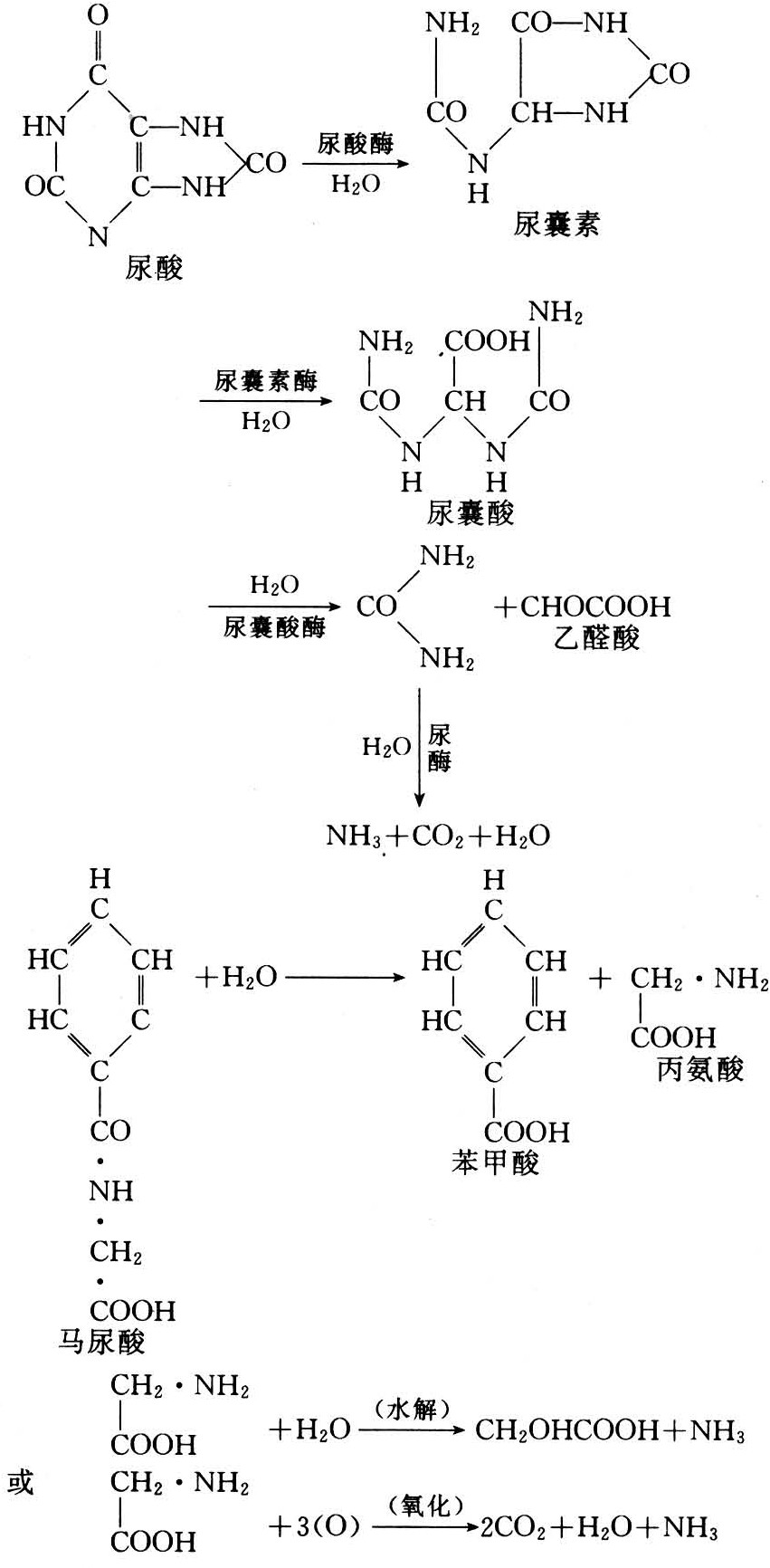 畜粪中的碳、氮化合物多数是迟效态的,须经微生物的分解才能被作物吸收利用(见厩肥),钾大部分是水溶性的;畜尿是良好的氮钾肥料,磷的含量少,呈碱性反应。其中尿酸和马尿酸分解慢,一般尿素分解时间如为2天,尿酸则需10天,而马尿酸在24天内仅能分解其全氮的33%,因此畜尿不宜直接施用。尿酸及马尿酸的分解过程为: