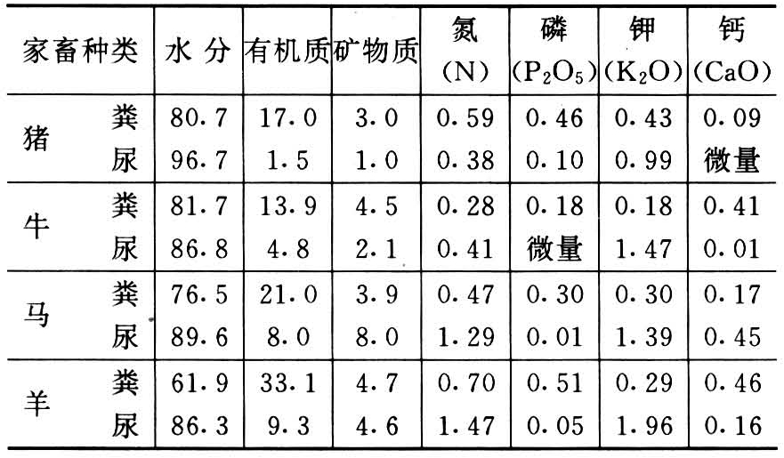 由于家畜种类、年龄、饲料性质及饲养方法的不同,畜粪尿的性质成分差异很大。