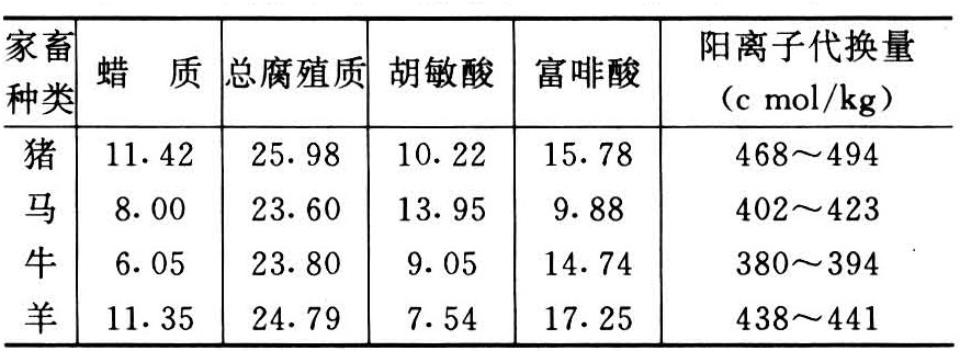 主要家畜粪尿的有机质、养分平均含量及腐殖质总量阳离子交换量列于表1、表2。